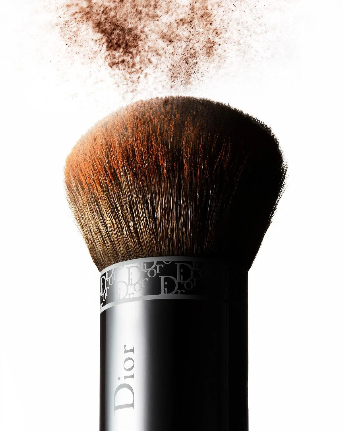 Still life cosmetic photography capturing powder in motion with controlled lighting.